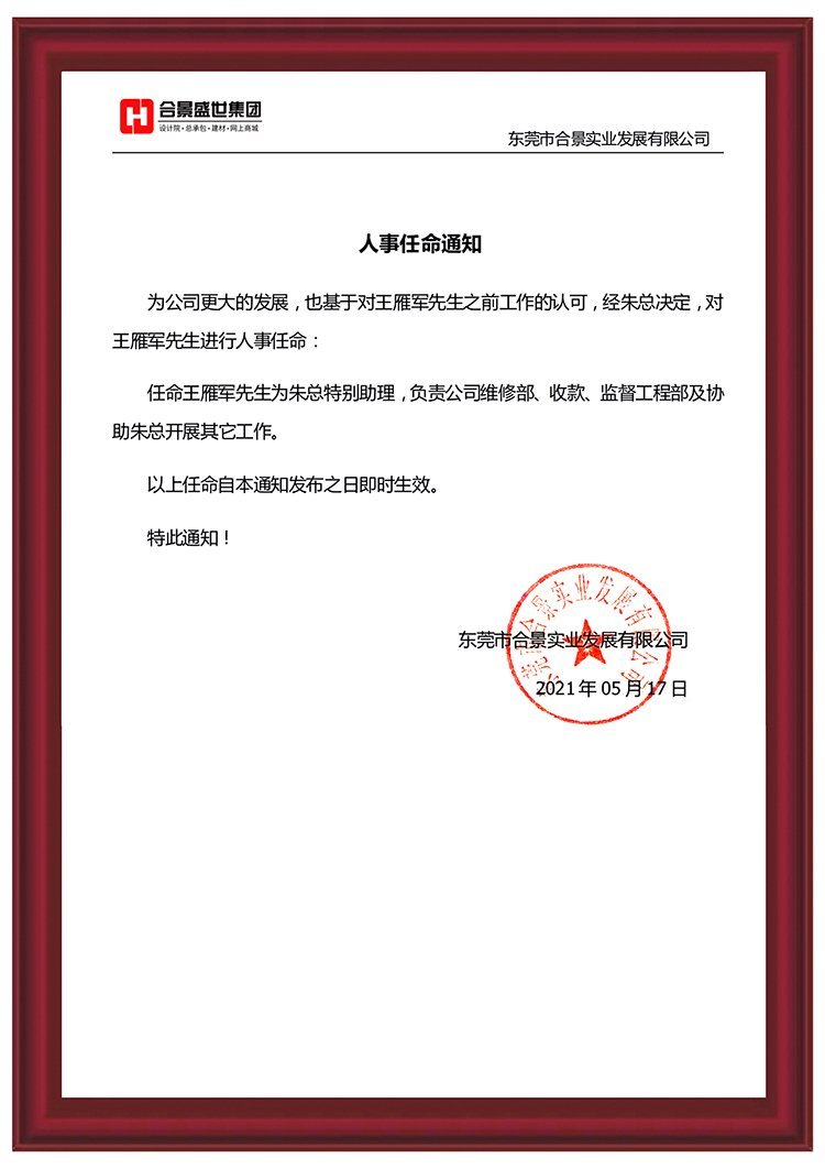 為推動(dòng)公司更大發(fā)展,經(jīng)公司綜合評(píng)估,王雁軍先生將擔(dān)任朱總特別助理,負(fù)責(zé)公司維修部、收款、監(jiān)理部及協(xié)助總經(jīng)理開(kāi)展其他工作。